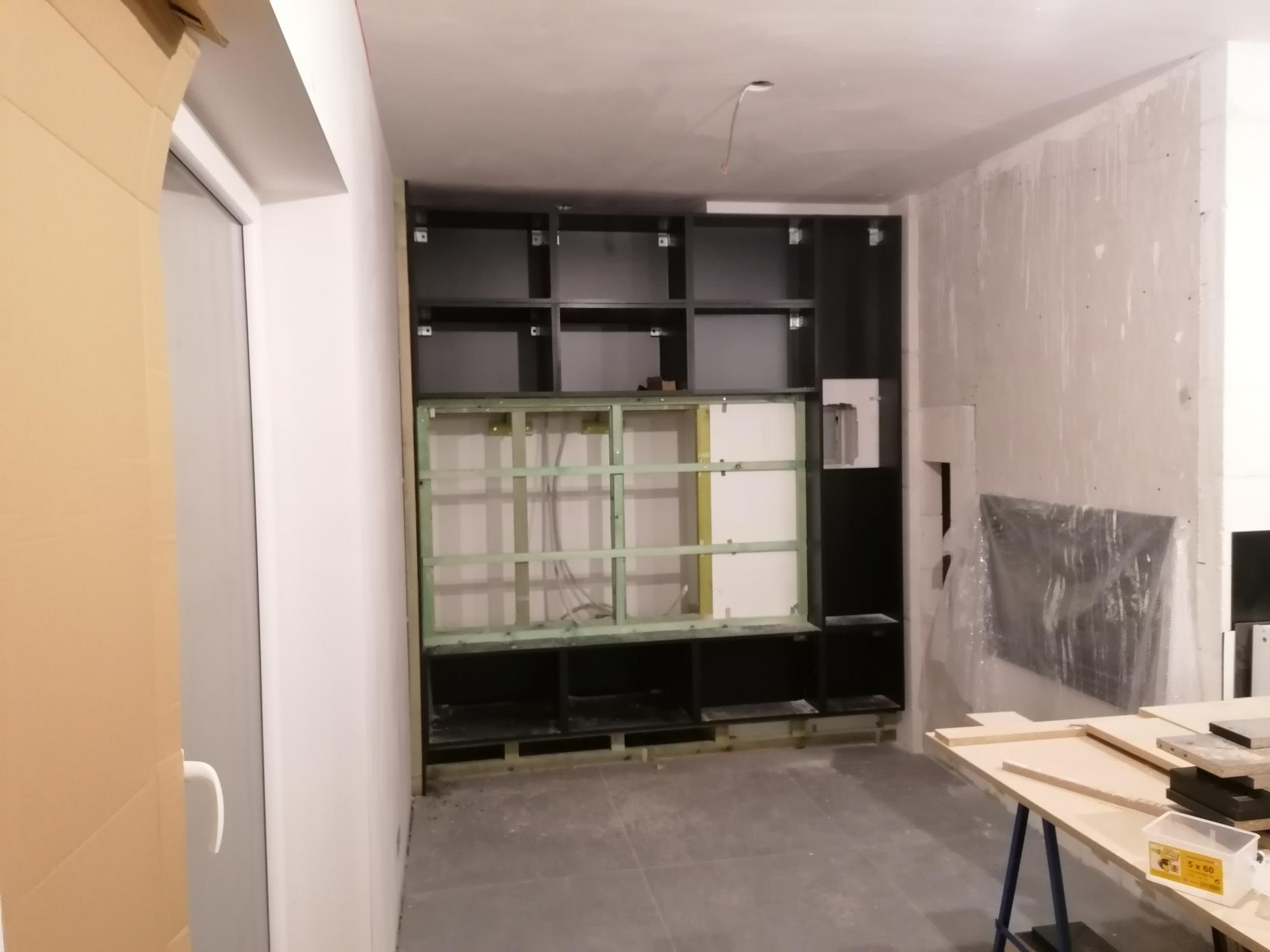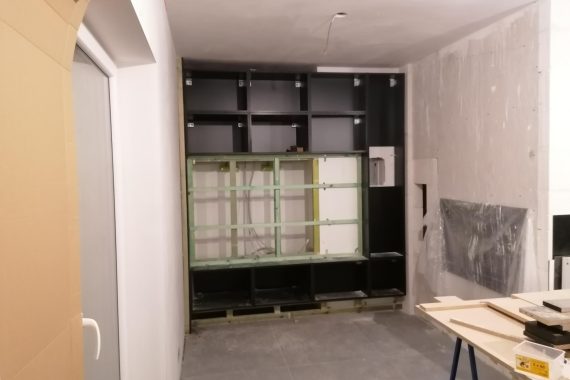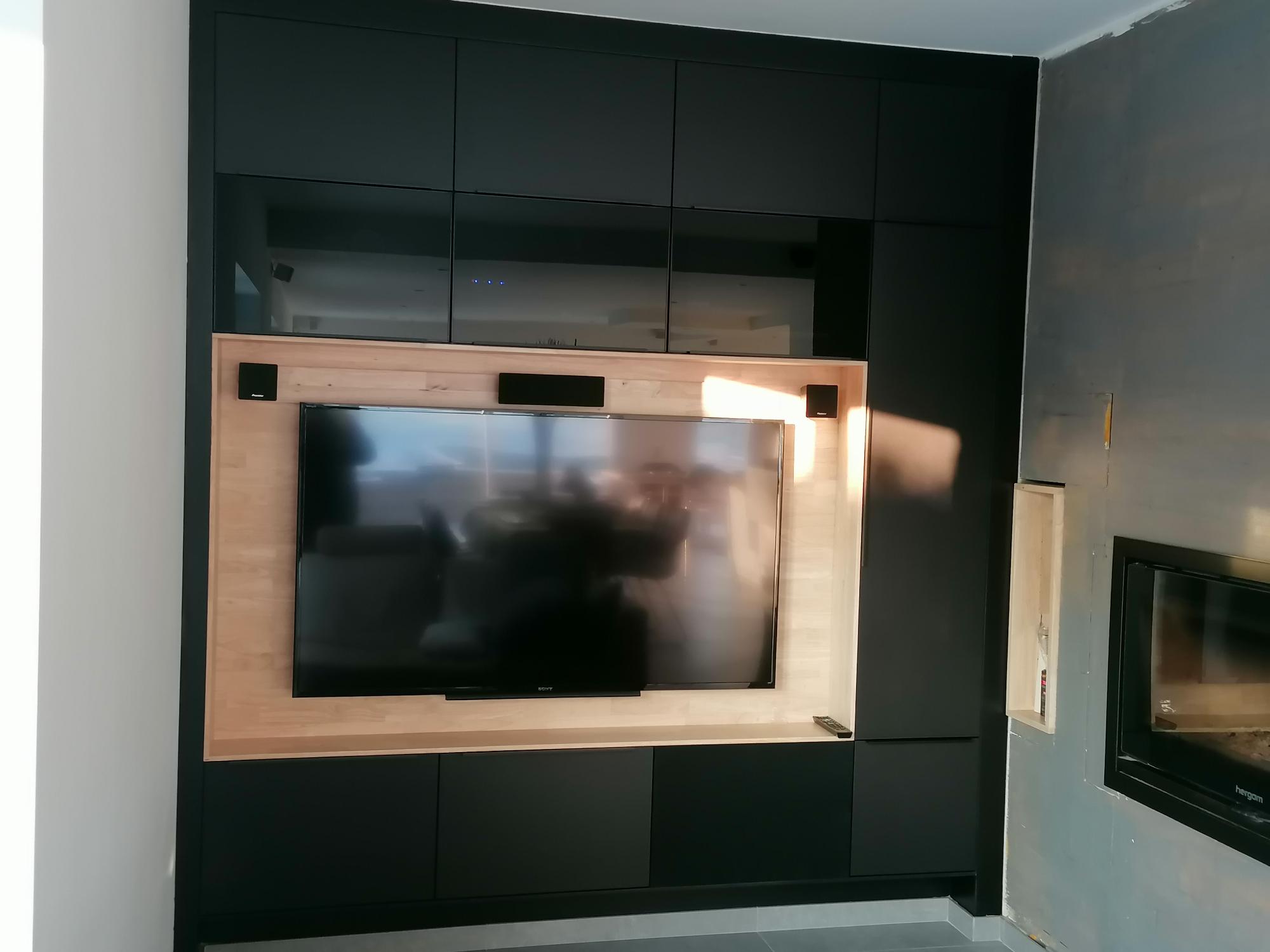 réalisation d’un meuble tv sur mesure encastré en MDF noir et Evéa massif. – L’un des objectifs était de dissimulé la cheminée avec une structure extérieur plane – ce meuble comprend également un caisson Bass dissimulé derrière une toile noir