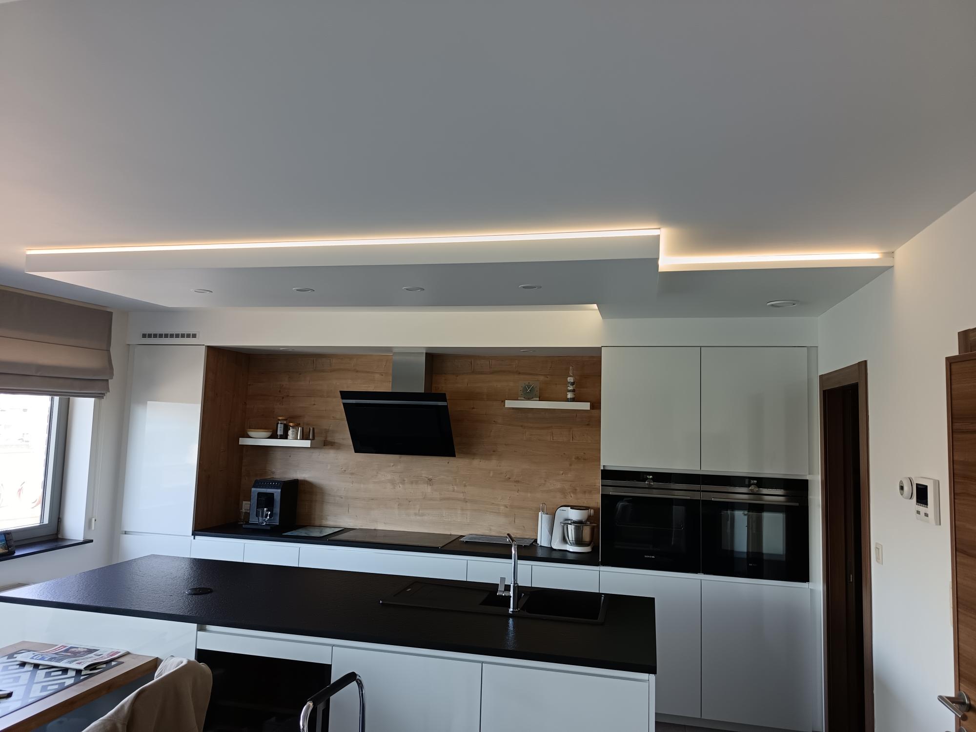 réalisation d’un plafond modulaire composé de deux éléments de taille et hauteur différente intégré l’un dans l’autre – rail led périphérique à la base – spot encastré dans l’ensemble