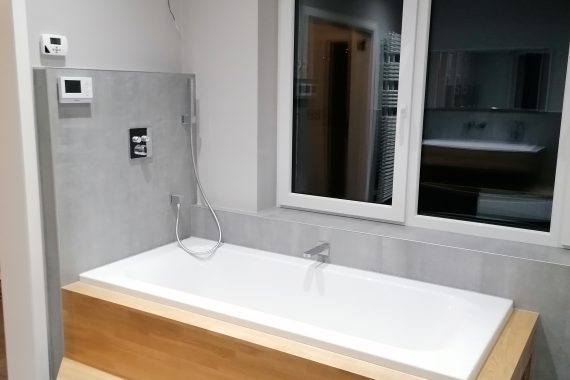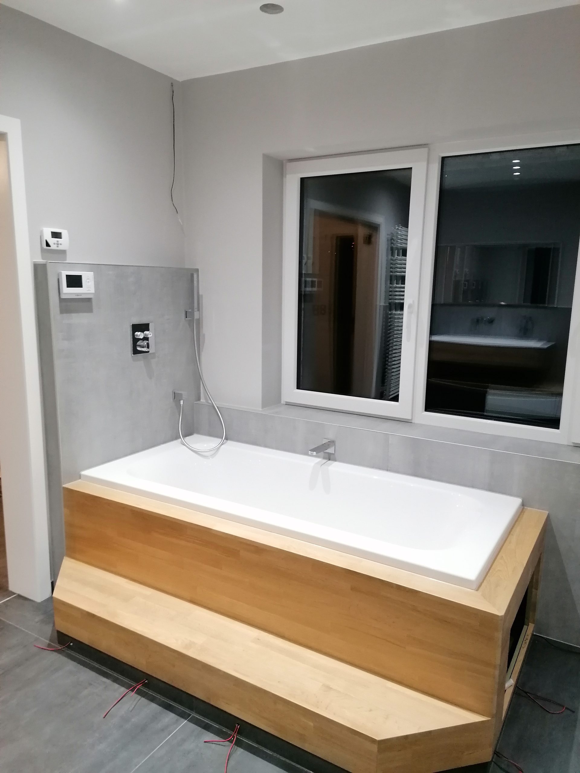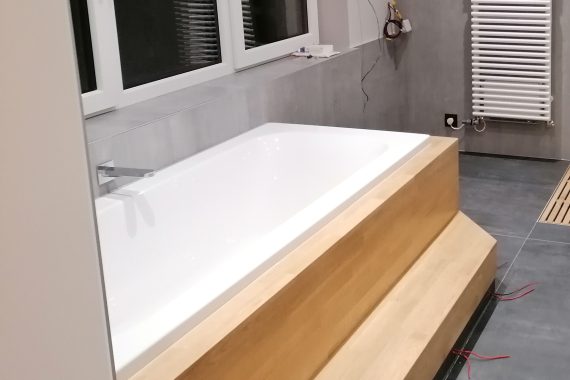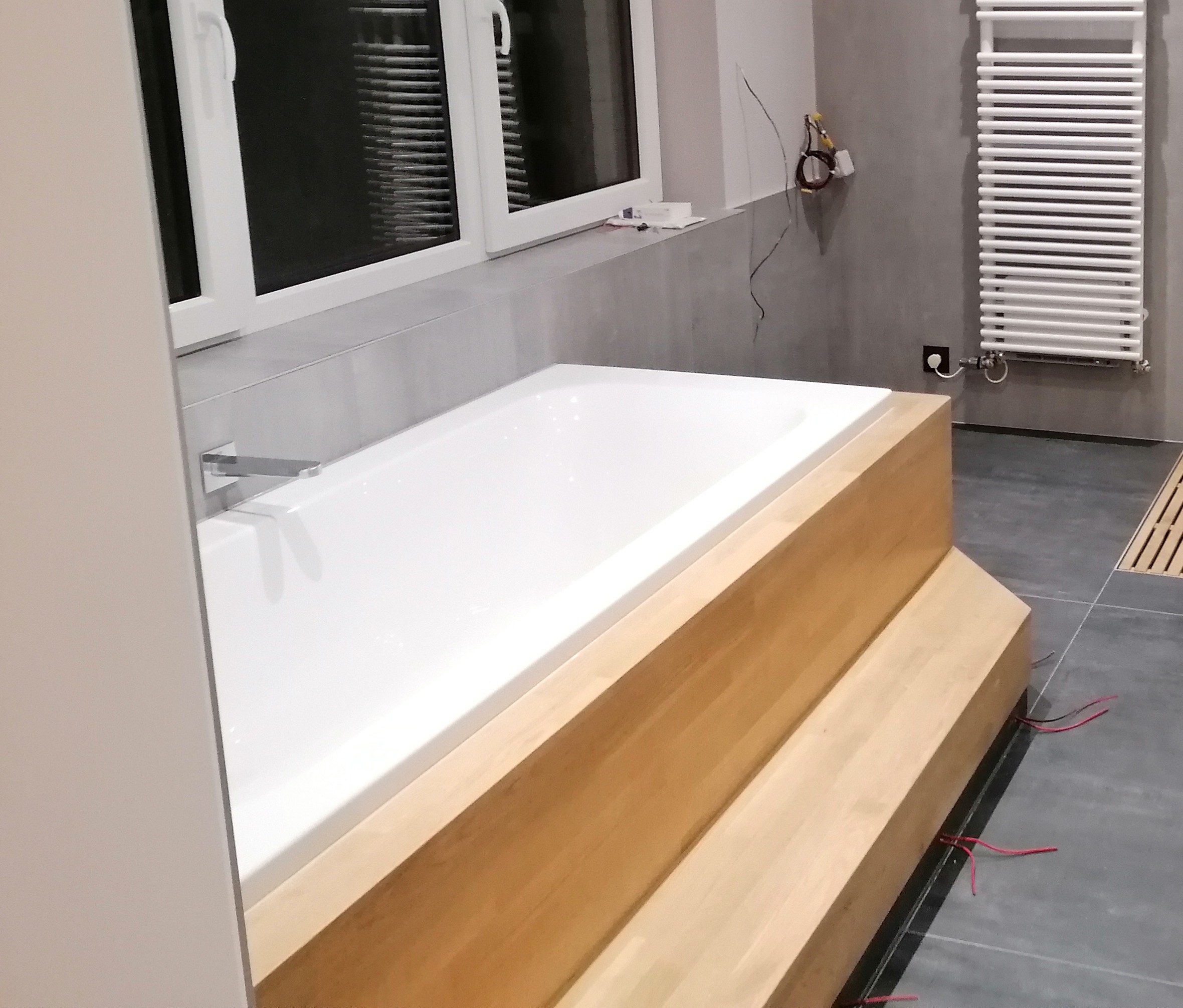 réalisation d’un tablier de baignoire en chêne massif, avec marche et éclairage intégré dans le pied de la marche