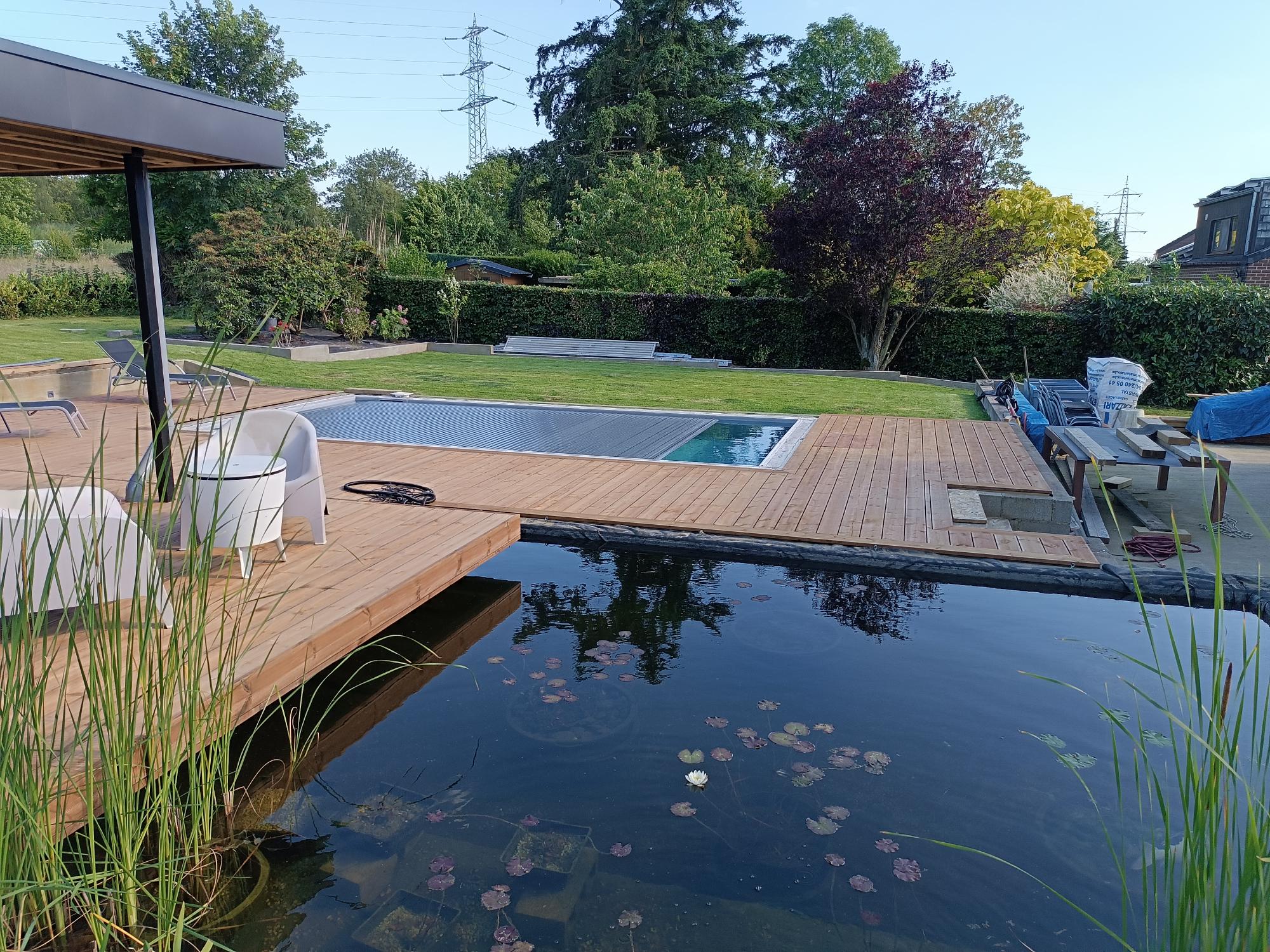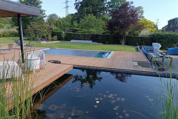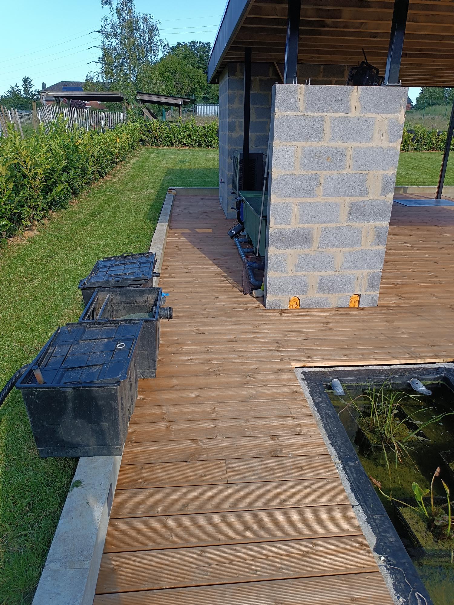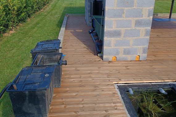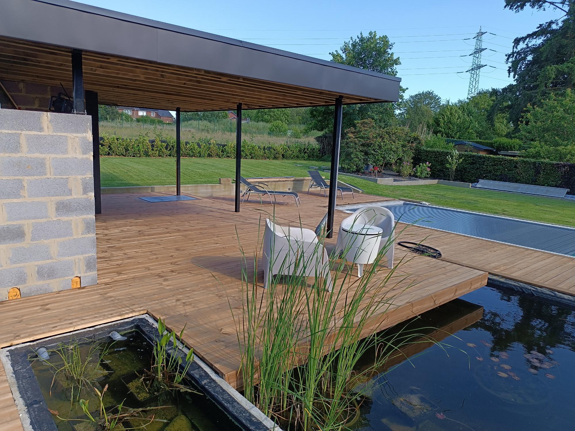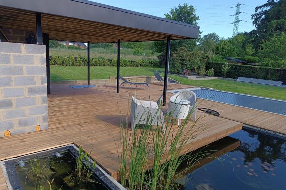Réalisation d’une terrasse extérieur à plusieurs niveaux en structure autoportante , dont une partie suspendue au dessus de l’étang